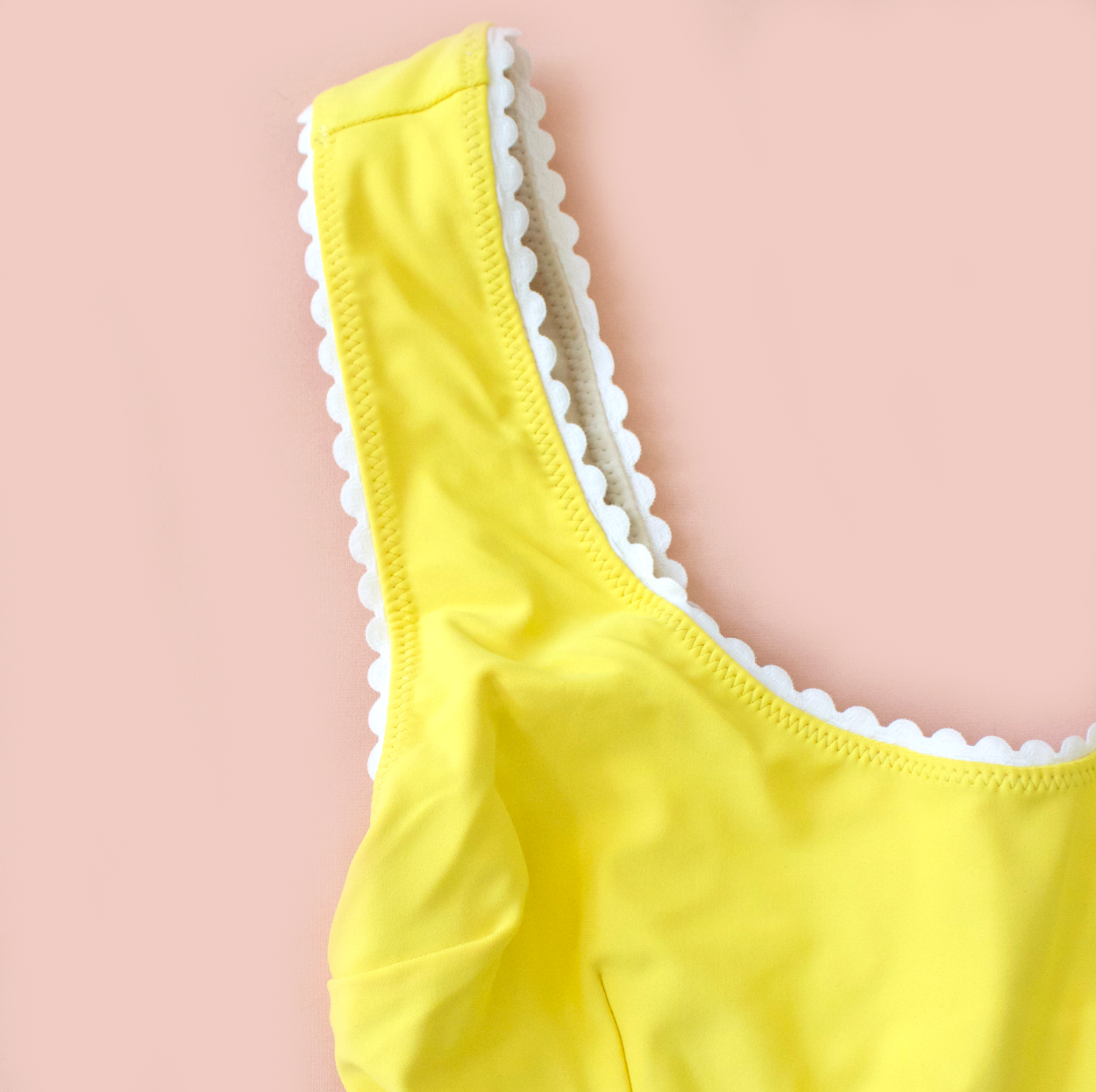 The Hammies Bikini is based on one of the original bikini styles from the 1960s. It combines elements from a couple of our favorite vintage styles - white rick rack trim, faux button closure in the back, and fun colors!