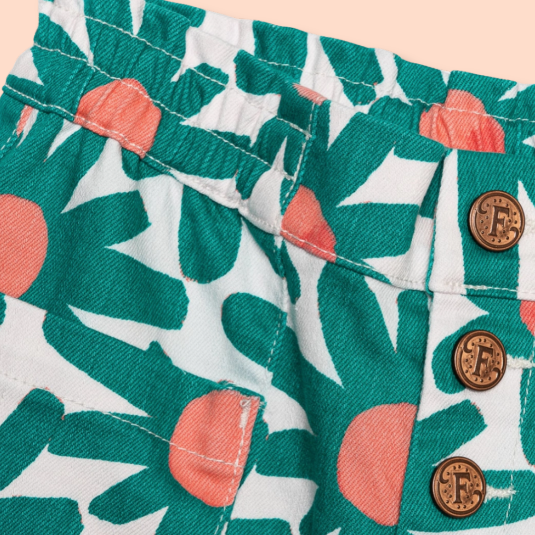 These wide-leg pants are cropped right above the ankle and feature a raw-edge hem. Doused in a custom sun-washed print and topped with a functional snap placket, elastic waistband, and pouchy pockets, these better-than-basic bottoms will take the place of her everyday denim.